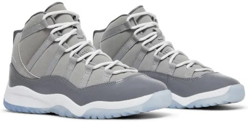The 2021 reissue of the Air Jordan 11 Retro PS Cool Grey celebrates the shoes 20th anniversary with a scaled-down edition made for little kids. The build is faithful to the original 2001 release, featuring a grey nubuck upper with tonal webbing lace loops and a glossy patent leather overlay. Branding hits include a Jumpman logo embroidered on the lateral ankle and 23 stamped on the back tab. The sneakers lightweight tooling comprises a white Phylon midsole and translucent rubber outsole.