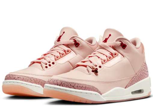 The Jordan 3 Retro Valentines Day Treat Yourself (2025) (Womens) is a love letter to sneaker enthusiasts who appreciate a perfect blend of style and nostalgia. Dressed in a luxurious washed coral leather upper, this special edition release stays true to the classic Jordan 3 silhouette while adding a romantic twist. The iconic elephant print appears on the mudguard and heel in a shimmering pink hue, creating a subtle contrast that elevates the overall design. Adding to its charm, gym red accents highlight the Jumpman logos and lower eyelets, giving the pair a striking pop of color. A standout feature is the set of two red jewel charmss, allowing wearers to personalize their look with a little extra sparkle. The midsole is finished in sail, complementing the pink upper, while a semi-translucent pink gum outsole provides the perfect finishing touch. Whether worn for a Valentines date or simply as an everyday statement piece, this pair is a must-have for sneaker lovers.