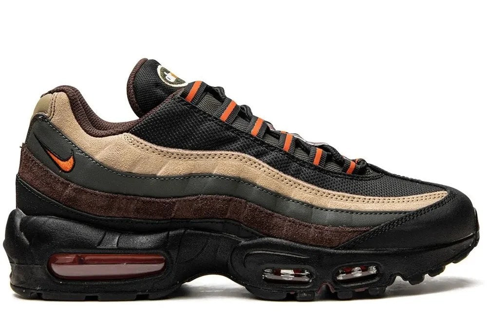Nikes Air Max 95 Dark Army sneakers feature a black, brown, green and beige colour scheme. This sneaker is constructed with a mix of leather, canvas and mesh panels highlighted by a Swoosh logo on the sides. Underneath, a rubber sole with Max Air cushioning completes the design.
